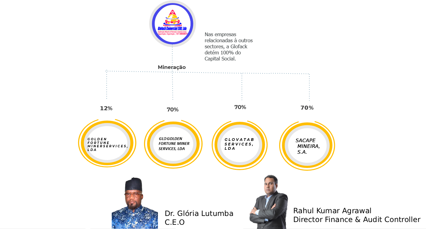 Na nossa filosofia de negócios, todas as decisões de alocação de capital são baseadas na criação de um portfólio de negócios diversificado e sólido, é assim que actuamos no sector da Mineração através da participação no capital social da GLOGOLDEN MINER SERVICES LDA, GLOVATAB SERVICES LDA, GOLD & DIAMON CONSULTING, LDA, SACAPE MINEIRA, S.A. .